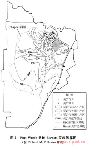 熱成因型頁(yè)巖氣又可分為3個(gè)亞類:①高熱成熟度型,如美國(guó)Fort Worth盆地的Barnett頁(yè)巖氣藏;②低熱成熟度型,如Illinois盆地的New Albany頁(yè)巖氣藏;③混合巖性型,即大套頁(yè)巖與砂巖和粉砂巖夾層共同儲(chǔ)氣,如East Texas盆地的Bossier頁(yè)巖氣藏[1]。其中最典型代表是Fort Worth盆地的Barnett頁(yè)巖氣藏。