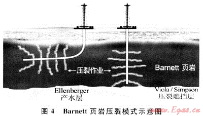 作為目前美國最活躍的頁巖氣遠(yuǎn)景區(qū),沃斯堡盆地Barnrtt頁巖的開發(fā)充分說明了直接及時的微地震描述技術(shù)的重要性[20~21]。經(jīng)營者運用該技術(shù)認(rèn)識到天然裂縫和斷層對水力壓裂裂縫的延伸及儲層產(chǎn)能和開采產(chǎn)生很大影響。2005年,美國Chesapeak能源公司于將微地震技術(shù)運用于一口垂直監(jiān)測井上,準(zhǔn)確地確定了Newark East氣田一口水平井進行的4段清水壓裂的裂縫高度、長度、方位角及其復(fù)雜性,改善了對壓裂效果的評價[19]。