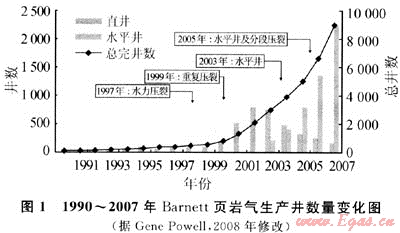 開發(fā)技術(shù)的創(chuàng)新尤其是水平井鉆井、壓裂技術(shù)以及裂縫綜合診斷技術(shù)的進步與廣泛運用在推動沃斯堡盆地Barnett頁巖氣藏的快速發(fā)展中起著至關(guān)重要的作用。1981年,Barnett頁巖區(qū)在按計劃鉆探過程中偶然發(fā)現(xiàn)顯示良好的Barnett頁巖層段。自1981年第一口發(fā)現(xiàn)井到1992年歷經(jīng)10a生產(chǎn)井僅99口,開發(fā)緩慢。1997年后,水力壓裂開始取代凝膠壓裂成為頁巖氣主要的增產(chǎn)措施,Barnett頁巖氣的開發(fā)也隨之加快了前進的步伐。隨著1999年重復(fù)壓裂、2003年水平鉆井以及2005年水平井分段壓裂等一系列新技術(shù)的廣泛運用,Barnett頁巖氣發(fā)展速度驚人(圖2),從1997~2007年的10a時間里,Barnett頁巖氣區(qū)有多達(dá)8629口頁巖氣井投入生產(chǎn)(其中水平井4973口,占50%以上)。新技術(shù)的運用同樣使Barnett頁巖氣產(chǎn)量發(fā)生了翻天覆地的變化,截至2008年1月,Barnett頁巖氣產(chǎn)量約0.996×108m3/d,累計產(chǎn)量1044.9×108m3[3]。