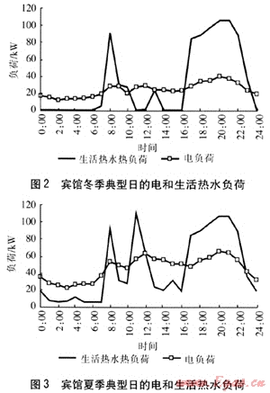 賓館的電負荷具有季節(jié)性特點,夏季電負荷明顯高于冬季。賓館冬季典型日電負荷比較穩(wěn)定,晚間用電負荷明顯增加;由于使用空調(diào),夏季典型日電負荷比冬季增加近1倍。