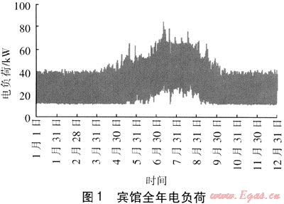 表1為該賓館電力和生活熱水參數(shù)。圖1為賓館全年電負荷情況,涂黑區(qū)域的上邊界線表示極大值,下邊界線表示極小值。圖2、3為賓館冬、夏兩季典型日的電負荷與生活熱水熱負荷。由于生活熱水在冬季和過渡季比較穩(wěn)定,隨著季節(jié)變化不大,因此以冬季典型日負荷曲線代表冬季和過渡季生活熱水變化情況。