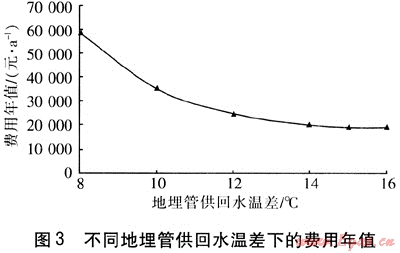 當(dāng)?shù)責(zé)嶝?fù)荷比例為80%、地埋管外徑為25mm時,對地埋管供回水溫差進(jìn)行優(yōu)化。不同地埋管供回水溫差下的費用年值見圖3。由圖3可知,費用年值在地埋管供回水溫差為15℃時最小。通過設(shè)計參數(shù)優(yōu)化設(shè)計可知,當(dāng)?shù)責(zé)嶝?fù)荷比例為80%、地埋管供回水溫差為15℃、地埋管外徑為25mm時,地?zé)崴疁厥夜嵯到y(tǒng)的經(jīng)濟(jì)性最好。