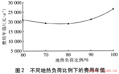 選取適中的地埋管回水溫度(30℃)、地埋管外徑(25mm),不同地?zé)嶝?fù)荷比例下的費用年值見圖2。由圖2可知,采用適中的地?zé)嶝?fù)荷比例,可獲得較低的費用年值。通過分析計算,不同供回水溫差、地埋管外徑下均存在類似的規(guī)律,因此可以確定地?zé)嶝?fù)荷比例為80%時,系統(tǒng)的經(jīng)濟(jì)性最好。