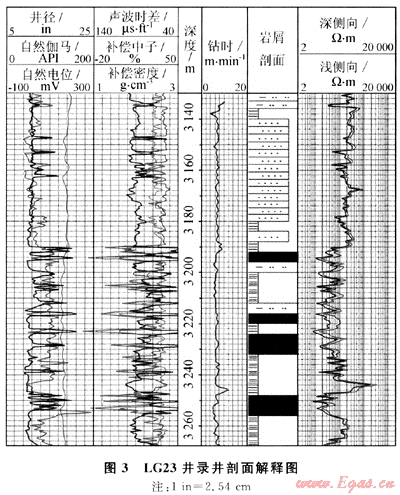 LG23井,試驗(yàn)(氮?dú)?井段3130.00~3683.00m。該井用自動(dòng)取樣裝置所取巖樣(每4m取1個(gè)樣)建立的錄井剖面,與測(cè)井解釋剖面符合率為87%(圖3)。
