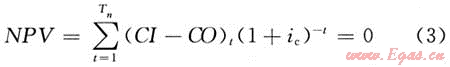 依據(jù)技術經(jīng)濟評價盈虧平衡原理,采用現(xiàn)值法,將投入和產(chǎn)出均折算為評價起始年的累計凈現(xiàn)值(NPV)為零作為極限,基本公式如下:
