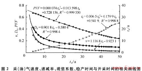 根據(jù)圖1模式生產(chǎn),以目前通用的石油行業(yè)基準收益率12%作為貼現(xiàn)率(ic),那么系數(shù)j=0.11333。通過理論計算,可以得出圖2所示的采(油)氣速度、遞減率、現(xiàn)值系數(shù)、穩(wěn)產(chǎn)時間與總生產(chǎn)時間的相關曲線。