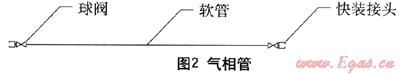 圖2為氣相管路,主要實現(xiàn)事故槽車、卸車壓縮機和搶險槽車的連接,主要由球閥、軟管和快裝接頭組成。由于設備及槽車所用快裝接頭皆為陽接頭,故軟管上所配接頭采用陰接頭。