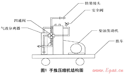 整個系統(tǒng)主要分為3個部分,壓縮機部分、液相閥門組和膠管部分,壓縮機采用手推車形式。發(fā)生事故時,直接裝入燃氣搶險車便可駛往事故現(xiàn)場,倉庫管理和調(diào)用都極為快捷方便,無需額外考慮附帶其他附屬設備。