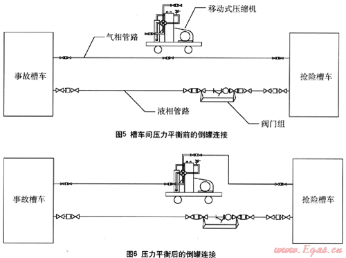 (3) 當壓縮機上入口壓力降低到2.8bar(294Pa)以下時候關閉事故槽車氣相出口和搶險槽車氣相出口,同時關閉柴油發(fā)動機。關閉事故槽車的液相口,同時各管段上閥門關閉后拆卸,倒罐流程到此結束??筛鶕?jù)現(xiàn)場實際情況安排后續(xù)的氮氣置換和吊裝拖運。