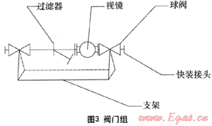 圖3所示閥門組主要是將一些液相管路上必須的設備集成在一個支架上以滿足進行快速的安裝需要。主要包括過濾器、視鏡、球閥、快裝接頭和支架。視鏡主要是用于觀測液相管路中液相輸送情況,其內(nèi)部自帶止回閥,可防止搶險槽車中的液相回流至事故槽車。