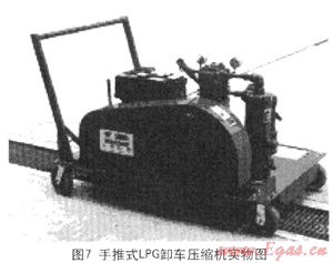 圖7手推式LPG卸車壓縮機可以實現(xiàn)在小片區(qū)域的人工改變位置,從而為小片區(qū)域的多個卸車點進行卸車;圖8為掛車式LPG卸車壓縮機,其中配備了更加齊全的附加設備,從而實現(xiàn)了大片區(qū)域的不同地點的卸車需求。目前該種移動式應急卸車設備在香港加德士石油公司、香港加德士石油公司、香港殼牌有限公司及汕頭加德士海洋燃氣有限公司配備使用,應該算作是用于搶險卸車的雛形狀態(tài)。
