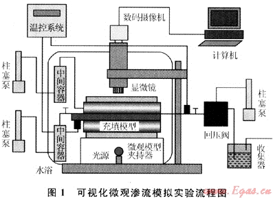 通過二維可視化物理模擬技術(shù)[4],可以定性和定量地觀察流體在地層內(nèi)的流動變化。二維可視化物理模擬技術(shù)分為間接技術(shù)和直接技術(shù)。間接技術(shù)主要有X射線、γ射線等菹接技術(shù)運用光源的照射,通過照相、攝像等使流動實驗過程可視化,直接技術(shù)相對成熟。
