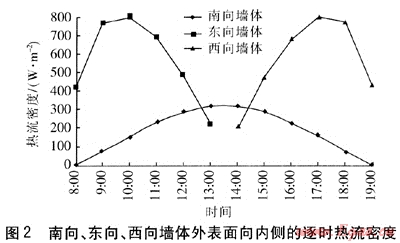 采用式(1)~(6)計(jì)算不凍泉地區(qū)2008年9月7日8:00—19:00墻體外表面向內(nèi)側(cè)的逐時熱流密度,南向、東向、西向墻體外表面向內(nèi)側(cè)的逐時熱流密度見圖2。