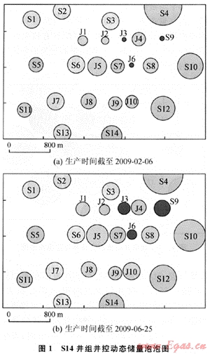 蘇里格氣田是典型的低滲透致密砂巖氣藏,筆者采用FAST.RTA軟件對(duì)蘇里格氣田的多口氣井進(jìn)行跟蹤分析,發(fā)現(xiàn)氣井的井控動(dòng)態(tài)儲(chǔ)量和泄流面積是隨生產(chǎn)時(shí)間動(dòng)態(tài)變化的。其中S14區(qū)塊加密井組的分析結(jié)果為:從投產(chǎn)日到2009年2月6日,平均井控動(dòng)態(tài)儲(chǔ)量為1698×104m3,平均單井等效泄流半徑為176m;從投產(chǎn)日到2009年6月5日,平均井控動(dòng)態(tài)儲(chǔ)量為1867×104m3,平均單井等效泄流半徑為191m。圖1列出了S14區(qū)塊加密井組不同生產(chǎn)時(shí)間段氣井的井控動(dòng)態(tài)儲(chǔ)量圖,氣泡的大小代表井控動(dòng)態(tài)儲(chǔ)量的相對(duì)大小,不同顏色表示氣井的投產(chǎn)時(shí)間不同。