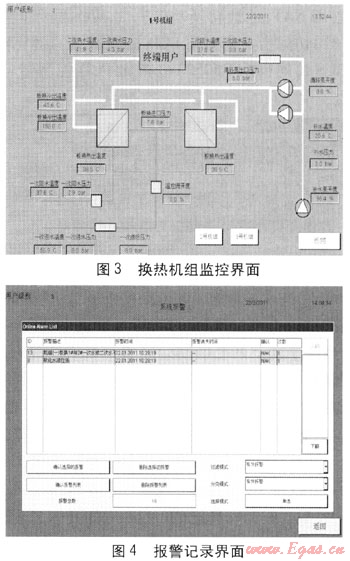 某城市集中供熱工程包括40座熱力站,項目規(guī)劃供熱面積為350×104m2。該項目分兩期建設,一期工程于2009年4月開工建設,已完成11座熱力站的安裝調(diào)試。熱力站控制器采用了具有嵌入式Web服務器功能的SAIA PCD系列控制器。換熱機組監(jiān)控界面、報警記錄界面分別見圖3、4。