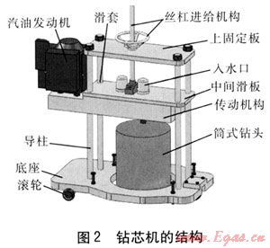 鉆芯機的結構見圖2,主要由動力源、傳動機構、進給機構、導向機構、鉆頭、底座等組成。