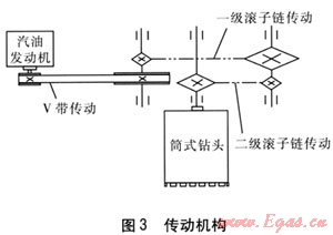 傳動機構采用V帶傳動和兩級滾子鏈傳動,通過多級減速傳動輸出,帶動筒式鉆頭旋轉切割,傳動機構見圖3。