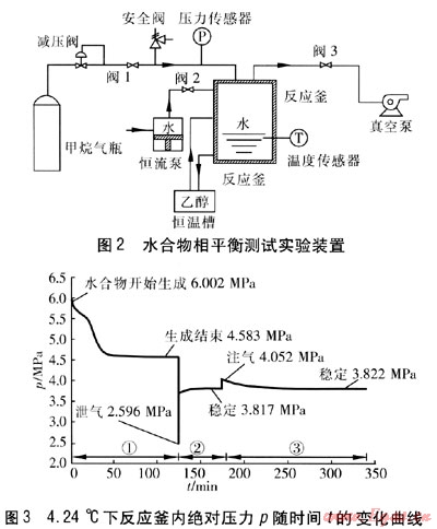 在恒定的反應(yīng)釜容積下,保持實(shí)驗(yàn)溫度不變,使水過量,充入甲烷,使反應(yīng)釜內(nèi)初始?jí)毫Ω哂趯?shí)驗(yàn)溫度所對(duì)應(yīng)的平衡壓力。當(dāng)有水合物生成,且反應(yīng)釜內(nèi)壓力不再下降時(shí),穩(wěn)定1~3h之后,將反應(yīng)釜內(nèi)壓力泄至實(shí)驗(yàn)溫度對(duì)應(yīng)的平衡壓力以下,此時(shí)水合物大量分解,壓力開始上升。當(dāng)壓力不再上升時(shí),穩(wěn)定1~3h,再充入甲烷,升壓至實(shí)驗(yàn)溫度對(duì)應(yīng)的平衡壓力以上,使水合物再次生成。如此反復(fù)幾次,取其值最接近的升壓后的壓力值和降壓后的壓力值的平均值,作為該溫度下的水合物相平衡壓力值。