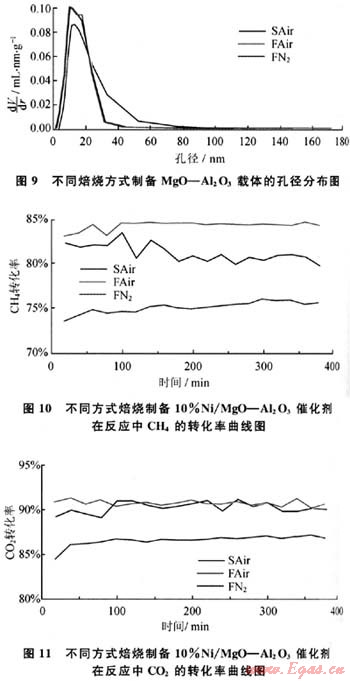 圖9為不同方式焙燒制備4%MgO-Al203載體的孔徑分布曲線。從圖中可以看出,3種不同焙燒方式所得載體的孔徑分布主要集中在13nm,在流動空氣和流動氮氣焙燒方式下所得到的孔徑和孔體積差不多,而在靜態(tài)空氣方式下焙燒的載體的孔徑和孔體積較小,但其孔徑的分布較為松散。