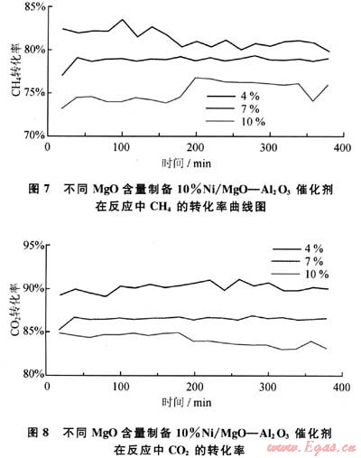 圖7、圖8為不同含量MgO-Al203載體制成10%Ni/MgO-Al203催化劑在反應(yīng)中CH4和CO2的轉(zhuǎn)化率。從圖7、8中可以看出,在反應(yīng)過程中10%Ni/4%MgO-Al203催化劑的催化活性最高,CH4和CO2轉(zhuǎn)化率分別為82%和90%左右。隨著反應(yīng)的進行,10%Ni/4%MgO-Al203催化劑的催化活性略有浮動,但其轉(zhuǎn)化率仍然較高,在整個反應(yīng)過程中催化劑的催化活性變化都不是很大,表明其穩(wěn)定性較好。