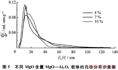 圖5為共沉淀法制備MgO-Al203的孔徑分布曲線。從圖5中可以看出,3種不同MgO含量載體的孔徑分布較為集中,主要在12nm,7%MgO-Al203、10%MgO-Al203的孔徑和孔體積差不多,4%MgO-Al203載體的孔徑和孔體積較小。