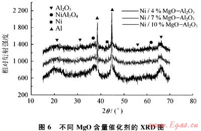圖6為不同MgO含量的載體催化劑的XRD譜圖,通過與標準譜圖對比可以看出,在2口為36°和62°兩處出現(xiàn)NiAl2O4尖晶石的衍射峰,4%MgO-Al203載體曲線中NiAl2O4的衍射峰很弱,但隨著MgO加入量的增加,NiAl2O4的衍射峰逐漸增強,說明Ni與Al2O3的相互作用增強,活性中心Ni逐漸減少,而且4%MgO-Al203載體的曲線比較散漫,表明粒徑分布較為均勻,使得催化活性較好。