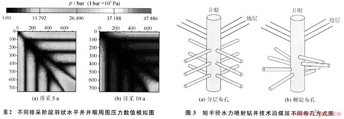 短半徑水力噴射鉆井技術(shù),其特點(diǎn)是可以實(shí)現(xiàn)在0.12m直徑的立井井段中完成從垂直轉(zhuǎn)向水平,并可以沿不同方位對(duì)煤層鉆水平孔眼開采煤層氣(圖3)。與常規(guī)直井水力壓裂相比,短半徑水力噴射鉆井具備定向效果好、穿透深度長等一系列技術(shù)優(yōu)勢(shì)[12~13]:①水力噴射可以沿井筒任意方位進(jìn)行,從而可根據(jù)煤儲(chǔ)層應(yīng)力分布情況,使水平孔眼最大限度地溝通煤層天然裂縫,提高裂縫的導(dǎo)流能力;②能根據(jù)需求在煤層中沿不同方位鉆出120m以上的長直孔,從而可以增大井眼與煤儲(chǔ)層接觸面積,擴(kuò)大煤層氣井的降壓解吸范圍;③煤層鉆孔后,孔眼周圍煤儲(chǔ)層應(yīng)力降低,形成新的微裂紋,從而可以提高水平孔眼周圍煤儲(chǔ)層透率;④水平孔眼可采取分層布孔或螺旋布孔,通過優(yōu)化孔眼結(jié)構(gòu)、充分利用孔眼間相互干擾作用可加快區(qū)域煤層氣降壓解吸,提高煤層氣井單井產(chǎn)量。