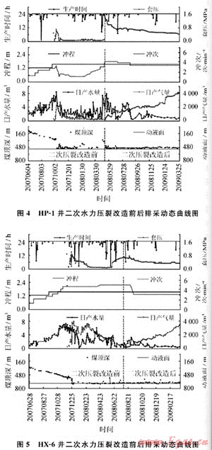 以HP-1井和HX-6井為例(如圖4、5所示)。HP-1井二次壓裂改造前套壓僅0.05MPa左右,產(chǎn)氣385m3/d,產(chǎn)水2.1m3/d,通過采取活性水二次壓裂(壓裂液液量134.4m3,排量3.5m3/min,加砂量2.4%)改造后,套壓上升到0.42MPa,產(chǎn)氣4062m3/d,產(chǎn)水0.8m3/d,單井日產(chǎn)氣提高了10倍。HX1-6井二次壓裂改造前套壓為0.04MPa左右,產(chǎn)氣775m3/d,產(chǎn)水5.3m3/d,通過采取活性水二次壓裂(壓裂液液量104.0m3,排量4.0m3/min,加砂量3.8%)改造后,套壓上升到0.30MPa,產(chǎn)氣2120m3/d,產(chǎn)水0.9m3/d,單井日產(chǎn)氣也提高了3倍[10~11]。