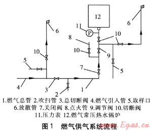 燃氣供氣系統(tǒng)流程見圖1。燃氣管道在停止運行進行檢修時,為檢修工作安全,需要管道內(nèi)的燃氣吹掃干凈。系統(tǒng)在較長時間停止工作后再投入運行前,也需要進行吹掃。因此,在鍋爐房供氣系統(tǒng)設(shè)計中,應(yīng)設(shè)置吹掃和放散管道。放散管出口應(yīng)高出屋脊2m以上。由鍋爐房外部引入的燃氣總管,在進口處應(yīng)裝設(shè)燃氣總切斷閥,按燃氣流動的方向,閥前應(yīng)裝放散管,并在放散管上裝設(shè)取樣口,閥后應(yīng)裝吹掃管。為保證鍋爐安全可靠運行,要求供氣管和其他管道上安裝的附件連接嚴(yán)密可靠,能承受最高使用壓力,且不得裝設(shè)在高溫和有危險的地方[3、4]。