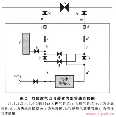 回收裝置通過耐壓金屬軟管,分別與隔離閥門兩側(cè)(檢修側(cè)、運行側(cè))的放散閥門管道連接,位于檢修側(cè)(A2)為進氣管路,運行側(cè)(A1)則為排氣管路。金屬軟管借助于特制的快速連接器與放散管道相連接,選擇不同口徑的快速連接器接頭,可實現(xiàn)同一條金屬軟管管與不同管徑放散管道快速聯(lián)通,以節(jié)省安裝時間。