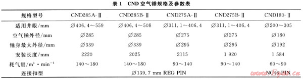 鑒于空氣錘獨(dú)特的技術(shù)優(yōu)勢(shì)[1~2],中原油田鉆井工程技術(shù)研究院開展了CND型空氣錘的研制,具有結(jié)構(gòu)簡(jiǎn)單、故障率低、可靠性高、技術(shù)支持及時(shí)等特點(diǎn),主要技術(shù)性能指標(biāo)處于國(guó)內(nèi)領(lǐng)先水平。已完成285A、285B、275A、275B、Φ180mm3種型號(hào)5種規(guī)格空氣錘設(shè)計(jì)、研制。配套加工Φ444.5mm、Φ406.4mm、Φ320mm、Φ314.3mm、Φ311.1mm、Φ241.3mm、Φ215.9mm7種規(guī)格空氣錘鉆頭。開發(fā)研制了多種形式鉆頭防掉落安全機(jī)構(gòu),有效防止鉆頭斷裂入井。獨(dú)創(chuàng)設(shè)計(jì)了兩種鉆頭保徑齒結(jié)構(gòu)形式,有效降低了鉆頭徑向磨損,提高鉆頭壽命。自主設(shè)計(jì)了空氣錘配套工具:高壓定量注油機(jī)和液壓鏈鉗[3]。