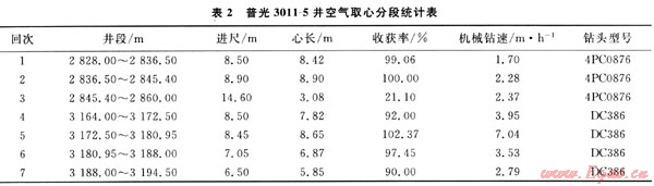 空氣鉆井取心與常規(guī)鉆井液鉆井取心不同,它是直接用大氣中的空氣作為循環(huán)介質(zhì)來(lái)冷卻鉆頭和攜帶巖屑,滿足鉆井取心需要的一種特殊取心方法。相比較常規(guī)取心,在取心配套工具、取心鉆井參數(shù)存在諸多難題:①取心工具因?yàn)闆]有鉆井液的潤(rùn)滑,導(dǎo)致懸掛軸承易失效,工具易磨損;②巖心爪長(zhǎng)期與巖心摩擦形成高溫,不利于降溫,提前造成巖心爪損壞,割心難以保證成功;③空氣取心具有空氣鉆井的優(yōu)點(diǎn),鉆時(shí)很快,但對(duì)割心位置的巖性難以判斷。在普光氣田進(jìn)行了兩口井的空氣鉆井取心試驗(yàn),使用川7-5取心工具,機(jī)械鉆速為3.24m/h,而常規(guī)鉆井液取心機(jī)械鉆速只有0.5m/h。鉆具組合為Φ241.3mm(或Φ215.9mm)PDC+川7-5取心工具+Φ158mmDCX 3根+Φ127mmHWDP×15根+Φ127mmDP。空氣鉆取心技術(shù)參數(shù):鉆壓為20~30kN;轉(zhuǎn)速為35r/min;排氣量為120~130m3/min;立管壓力為2.2~2.4MPa(表2)。