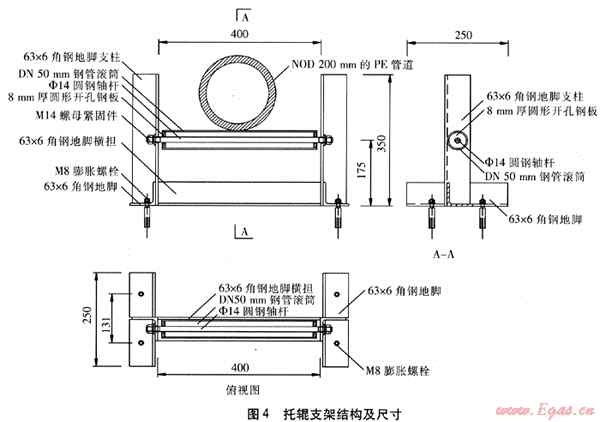 焊接完畢的待穿管PE管道,應每隔5m設1組托輥支架對其進行支撐。穿管作業(yè)時,前行的PE管道帶動滾筒圍繞軸桿轉動,接觸面呈滾動摩擦狀態(tài),一方面可防止PE管道被地表硬物劃傷,另一方面可減小穿管時的摩擦阻力,加快穿管作業(yè)進度,使PE管道沿預設的線路前進,不致于產(chǎn)生過大的偏移。托輥支架的結構及尺寸見圖4。