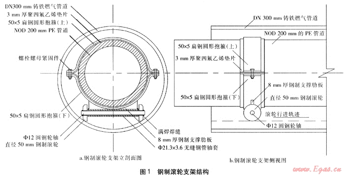 采用鋼制滾輪支架進行PE燃氣管道穿插套管的工藝原理為:以廢舊的鑄鐵燃氣管道作為套管,采用管徑稍小的PE管道作為穿插管[1],在PE燃氣管道上每隔一段距離安裝l組鋼制滾輪支架,通過抱箍的固定作用使PE管道載于鋼制滾輪支架之上;滾輪支架一方面支承PE燃氣管道自身重量,另一方面能使PE管道在套管內自由行進;通過人力、機械的牽引、推進作用,使PE管道順利穿過套管,代替原管道進行供氣,避免了大量開挖市政道路所帶來的困難。