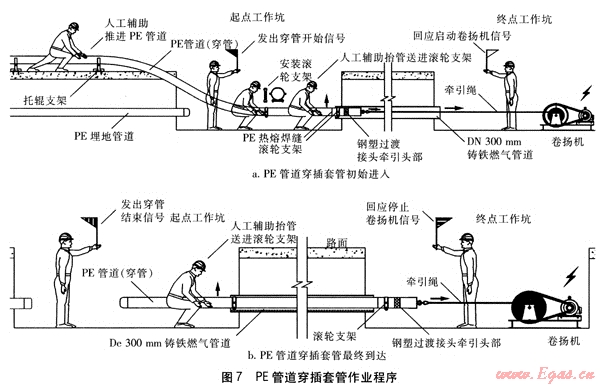 以下介紹以卷揚機作為機械牽引動力、以廢舊的DN 300mm鑄鐵燃氣管道作為套管、以NOD 200mm的PE燃氣管道進行穿插套管的施工技術。