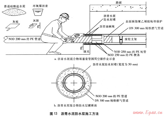 由于套管內NOD 250mm的PE短管、楔條的支承作用,由瀝青油麻、瀝青水泥組成的柔性防水層不會因PE燃氣管道自身重力、回填土的壓力而發(fā)生變形、破壞,確保其防水性能。