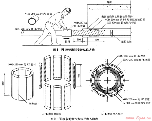 ② 如圖8所示,在NOD 200mm的PE管道上套入一截長度為300mm的NOD 250mm的PE短管(PE80、SDR11),并將其置于套管內;由于NOD 250mm的PE短管的內徑比NOD 200mm的PE燃氣管道的外徑略大,適合用作對NOD 200mm的PE燃氣管道進行限位、支承的承托。NOD 250mm的PE短管外側與套管端口的水平凈距為200mm,作為柔性防水層封堵的預留空間。