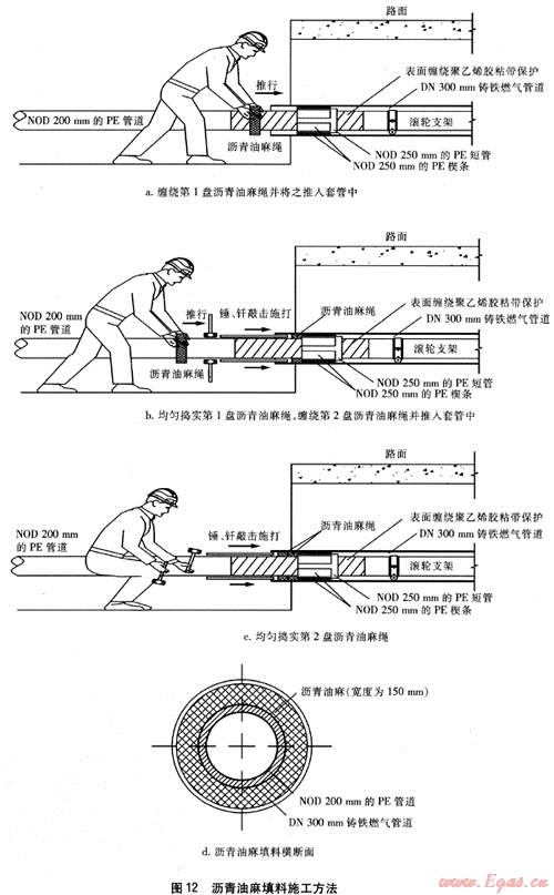 ④ 瀝青油麻填料一般分2次填塞,以確保其密實度,具體做法見圖12。將直徑為30mm的油麻繩用環(huán)氧煤瀝青漆浸泡15min后取出,均勻纏繞在NOD 200mm的PE燃氣管道上(PE管道表面事先纏繞1層聚乙烯膠粘帶保護,搭接寬度為膠粘帶寬度的50%,纏繞長度為1000mm),待形成寬度約80mm,外徑約300mm的盤狀繩圈后,將瀝青油麻繩推入套管內的空隙內,用直徑為20mm、一端為光圓鈍頭的鋼筋釬棒均勻搗實瀝青油麻繩,并使之緊貼于NOD 250mm的PE短管承托的外側端面上。按同樣要求纏繞、搗實第2盤瀝青油麻繩,瀝青油麻填料的最終寬度為150mm。
