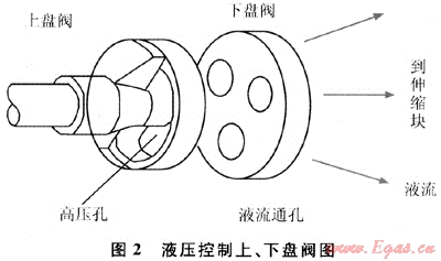 調(diào)制式旋轉(zhuǎn)導(dǎo)向鉆井工具(MRST)屬于推靠式旋轉(zhuǎn)導(dǎo)向鉆井工具(圖1)。由于其鉆柱與井壁之間不存在靜止點(diǎn),因此,在鉆井過程中更可體現(xiàn)旋轉(zhuǎn)鉆井的優(yōu)越性[1]。調(diào)制式旋轉(zhuǎn)導(dǎo)向鉆井系統(tǒng)導(dǎo)向力的大小和方向主要是由穩(wěn)定平臺控制的。當(dāng)需要最大導(dǎo)向力時,穩(wěn)定平臺控制軸就帶動上盤閥旋轉(zhuǎn),使上盤閥穩(wěn)定在預(yù)定方向,控制上盤閥高壓孔方向恒定。在鉆柱旋轉(zhuǎn)過程中,每個“巴掌”依次在該方向附近伸出拍打井壁,導(dǎo)向機(jī)構(gòu)對井壁的作用力就是這些拍打力的合力。這個合力的反力就是鉆柱受到的導(dǎo)向力,方向沿著上盤閥預(yù)定方向的反方向。當(dāng)不需要導(dǎo)向時,穩(wěn)定平臺帶動上盤閥以和鉆柱具有不同的某一轉(zhuǎn)速勻速轉(zhuǎn)動,這時“巴掌”均勻拍打井壁四周,導(dǎo)向工具可控制的液壓導(dǎo)向力的合力就等于零,此時導(dǎo)向工具呈中性工作狀態(tài),達(dá)到穩(wěn)斜效果。MRST液壓控制閥采用上、下盤閥結(jié)構(gòu),上盤閥與穩(wěn)定平臺控制軸相連接,它只有一個弧形長孔形狀的高壓閥孔。下盤閥與鉆柱本體連接,隨MRST外殼及鉆柱一起旋轉(zhuǎn),它有3個互成120°圓心角的等直徑低壓孔(泄流孔),見圖2。