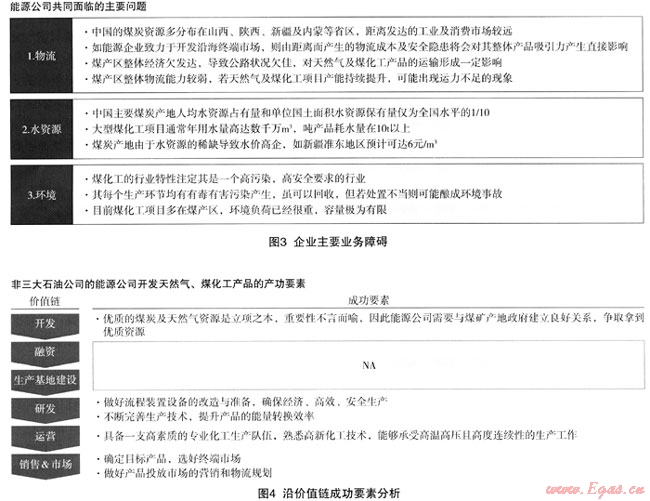從目前情況來看,能源企業(yè)要開發(fā)非常規(guī)天然氣從事煤化工業(yè)務(wù)均需要消除以下障礙(圖3)。第一,物流:中國的煤炭資源多分布在山西、陜西,尤其是新疆及內(nèi)蒙等省區(qū),距離發(fā)達(dá)的工業(yè)及消費(fèi)市場較遠(yuǎn)。物流成本及運(yùn)輸安全隱患將會(huì)對(duì)企業(yè)運(yùn)營產(chǎn)生直接影響。與此同時(shí),煤產(chǎn)區(qū)整體經(jīng)濟(jì)欠發(fā)達(dá),公路狀況欠佳,對(duì)天然氣及煤化工產(chǎn)品便利的運(yùn)輸也造成能源公司共同面臨的主要問題一定影響;第二,水資源:中國主要煤炭產(chǎn)地人均水資源占有量和單位國土面積水資源保有量僅為全國平均水平的1/10,而大型煤化工項(xiàng)目通常年用水量高達(dá)數(shù)千萬m3,噸產(chǎn)品耗水量在1Ot左右,供求關(guān)系的嚴(yán)重失衡,造成煤炭產(chǎn)地水價(jià)高企,如新疆某煤化工園區(qū)的水價(jià)預(yù)測可達(dá)6元/m3,對(duì)項(xiàng)目經(jīng)濟(jì)陛產(chǎn)生較大影響;第三,環(huán)境:煤化工的行業(yè)是高污染,高安全要求的行業(yè)。每個(gè)生產(chǎn)環(huán)節(jié)均有有毒有害污染物產(chǎn)生,如若處置不當(dāng)就可能釀成環(huán)境事故。目前煤化工項(xiàng)目多在煤產(chǎn)區(qū),環(huán)境負(fù)荷已經(jīng)很重,環(huán)境容量有限,若一哄而上以產(chǎn)能、產(chǎn)量為目標(biāo),則可能對(duì)環(huán)境造成無法挽回的影響。