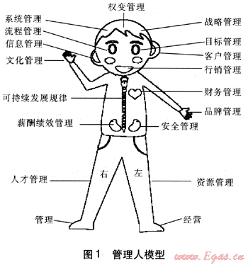 現(xiàn)代市場經(jīng)濟下的企業(yè)管理,就是帶有知識經(jīng)濟、網(wǎng)絡(luò)經(jīng)濟、信息經(jīng)濟色彩的企業(yè)管理,就是對技術(shù)、信息的把握,帶有中西方文化大融合特色對人的管理。各種管理理論都是管理學(xué)家站在不同角度,用不同語言解讀企業(yè)可持續(xù)發(fā)展規(guī)律的不同層次。而管理人模型(見圖1)就是以人為模板,按照人的幾大系統(tǒng)相互協(xié)作,以人的大腦指揮著兩只腳向目標(biāo)前進(jìn)為基礎(chǔ)。確立“一個腦袋兩只腳”的管理人模型,就是具有戰(zhàn)略思維的“大腦”,指揮著圍繞市場活動的“經(jīng)營左腳”,圍繞企業(yè)內(nèi)部的“管理右腳”,帶動企業(yè)這個法人不停地向前走。