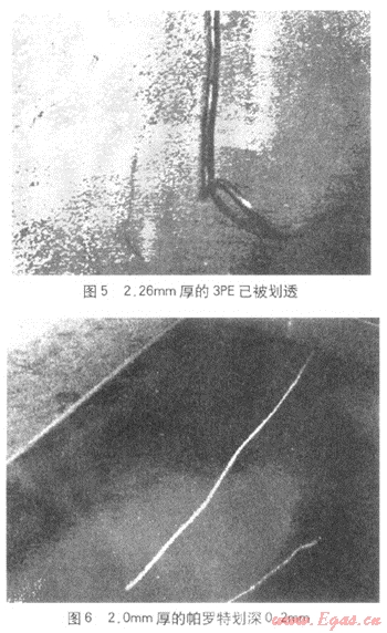 國內(nèi)外法定檢驗(yàn)機(jī)構(gòu)的檢測結(jié)果表明,雙層環(huán)氧聚合物混凝土結(jié)構(gòu)涂層具有比3PE更優(yōu)異的耐劃傷性(圖5、6)、耐磨損性,其補(bǔ)口處與管體同高,還與陰極保護(hù)系統(tǒng)有很好的匹配性。帕羅特已被美國定向穿越工程承包協(xié)會DC CA(Directional Crossing Contractors Association)指定為定向穿越覆蓋層專用保護(hù)產(chǎn)品。