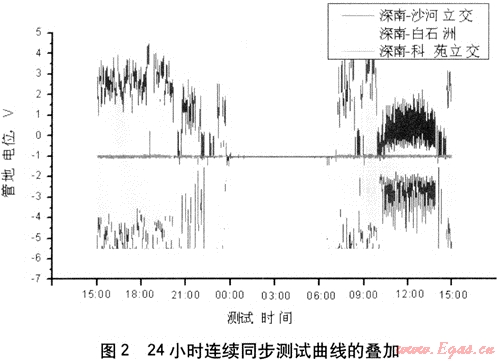 表1為深南-科苑立交、沙河立交、白石洲管地電位24小時(shí)連續(xù)同步測(cè)試數(shù)據(jù),圖2為上述測(cè)試點(diǎn)的24小時(shí)連續(xù)同步測(cè)試曲線(xiàn)的疊加。