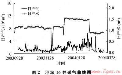 青海氣區(qū)的澀北一號(hào)氣田,從2000年以來(lái)屬于建產(chǎn)上產(chǎn)階段,但調(diào)峰氣量卻逐年加大。由于調(diào)峰對(duì)氣、水產(chǎn)量的影響也很明顯。統(tǒng)計(jì)2003年冬季該氣田主要參與調(diào)峰提產(chǎn)的13口氣井,提產(chǎn)前日產(chǎn)氣量87.4×104m3,日產(chǎn)水3.9m3,調(diào)峰期(61d)日產(chǎn)氣108×104m3,日產(chǎn)水9m3,調(diào)峰結(jié)束恢復(fù)原工作制度后,日產(chǎn)氣82.5×104m3,日產(chǎn)水8.7m3。很明顯氣量減少,而水量增加。如澀深16井調(diào)峰前后的氣、水產(chǎn)量曲線(xiàn)(圖2),調(diào)峰結(jié)束后氣量達(dá)不到調(diào)峰前的水平,而產(chǎn)水量卻明顯上升。