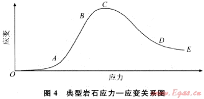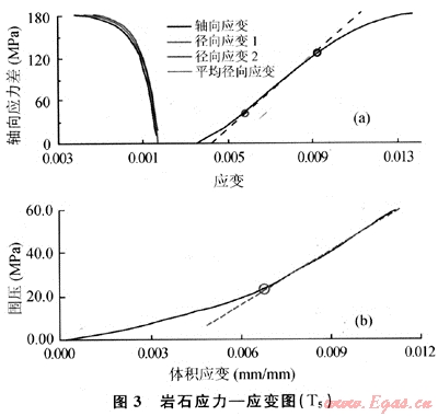 圖3是采用三軸巖石力學(xué)測試系統(tǒng)得到的巖石應(yīng)力-應(yīng)變關(guān)系曲線。從圖3-a可以看出:在應(yīng)力增大的初始階段,巖石發(fā)生的變形較大,有一定軟塑性變形,隨著軸向應(yīng)力增大(超過30MPa),逐漸過渡到穩(wěn)定的彈性變形階段,超過彈性極限后,巖石進(jìn)入塑性變形階段,最終破壞失穩(wěn)。從圖3-b則可以更明顯地看出巖石在圍壓增大的初始階段變形較大,整個(gè)變形過程不是線彈性變形過程。