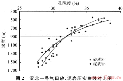 壓實(shí)作用是沉積物最重要的成巖作用之一,它導(dǎo)致孔隙水排除,孔隙度減少,巖石體密度增加。三湖地區(qū)第四系地層主要的成巖作用是壓實(shí)作用,不同巖性其壓實(shí)特征不盡相同。研究表明,壓實(shí)早期對(duì)泥巖的影響較對(duì)砂巖顯著,0~2000m深度范圍內(nèi),頁(yè)巖的孔隙度隨深度的變化速率相對(duì)較大,而砂巖的變化速率相對(duì)較小,在相同深度范圍內(nèi),泥質(zhì)巖物性變化的速率總比砂質(zhì)巖性大(圖2)。特別是深度超過900m,由于地層水的大量排出,泥巖塑性消失,已相當(dāng)致密且明顯成層;粉砂巖已趨于點(diǎn)接觸,但是膠結(jié)物較少,仍較疏松。泥質(zhì)巖壓實(shí)程度超過砂質(zhì)巖,兩者排替壓力差逐漸增大,泥巖層易形成側(cè)向封堵,有利于巖性氣藏形成。