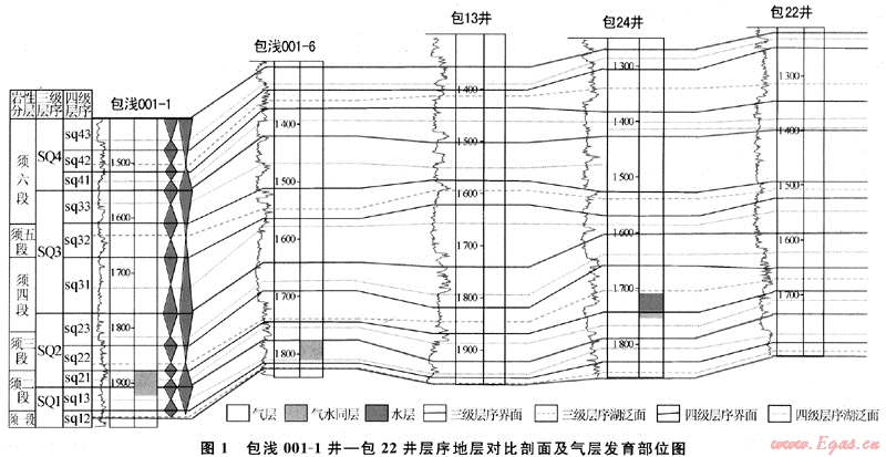 三級(jí)層序(SQ1~SQ4)的層序界面為不整合面或大型沖刷侵蝕面。層序界面在地震剖面中表現(xiàn)為削截與上超等反映地層不協(xié)調(diào)關(guān)系的地震反射,代表區(qū)域性的侵蝕間斷或無沉積型的間斷[2~4]。SQ1底界為須一段與下部嘉陵江組五段白云巖或雷口坡組二段石灰?guī)r的超覆不整合面。SQ4頂界為須六段與上部地層自流井不整合接觸面。SQ2、SQ3、SQ4的底界分別為發(fā)育于須二、須四、須六段大套砂巖內(nèi)部的大型沖刷侵蝕面[5~6],其主要特征為:①底部存在礫石或者泥礫,礫石有時(shí)有定向排列,有時(shí)雜亂無章,這種泥礫層在剖面上可連續(xù)追蹤,自然伽馬曲線呈箱形或鐘形,底部呈突變接觸關(guān)系;②發(fā)育大規(guī)模的起伏不平的侵蝕面,侵蝕底面明顯下切到先前的沉積體中,下切深度一般為1m左右;③有時(shí)存在風(fēng)化形成的黏土層或者菱鐵礦結(jié)核,此類現(xiàn)象出現(xiàn)在水上暴露的環(huán)境中;④有時(shí)存在大規(guī)模的植物莖干的堆積并且與其他巖性混雜在一起,此類現(xiàn)象一般發(fā)育在水下環(huán)境中的相對(duì)靜水湖灣地帶等;⑤有時(shí)發(fā)生物源的改變,比如由石英巖屑砂巖突變?yōu)殚L石巖屑砂巖,由于長石遭受風(fēng)化而在露頭剖面上形成一個(gè)松軟帶。