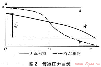 假設(shè)煤層氣在管道中正常輸運時,全線的壓力降主要是由管壁的摩擦引起的,其壓力曲線見圖2的粗實線,此時壓力基本上保持均勻下降,其兩端的壓力差用△p1來表示。