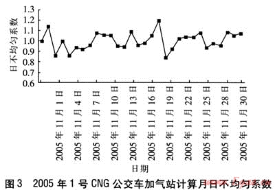仍以1號(hào)CNG公交車加氣站為例,2005年該CNG公交車加氣站月高峰系數(shù)出現(xiàn)在2005年11月,該月的日不均勻系數(shù)見圖3。2005年該CNG公交車加氣站11月份的日高峰系數(shù)出現(xiàn)在2005年11月18日,數(shù)值為1.197;日不均勻系數(shù)的最小值出現(xiàn)在2005年11月19日,數(shù)值為0.841。