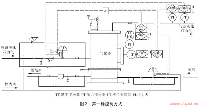 氣化器的控制方式比較靈活,實際生產(chǎn)中往往要根據(jù)現(xiàn)場的工況、氣化量、用途及性價比等因素綜合考慮,總之,系統(tǒng)要具有較強的抗干擾能力,應(yīng)易于擴展,對于安全性要求較高的場合應(yīng)本著滿足故障安全的設(shè)計原則。本文討論2種控制方式,分別見圖2和圖3。圖3的圖例同圖2。